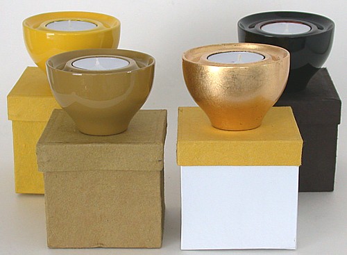 Stunning lacquerware wooden candle holders in assorted hi-gloss colors, space-age design, 2" tall, marked "Japan," each in its original gift box. We have included one easily replaced tea candle with each. Priced at only $10 each in your choice of color. Please note: Black and Yellow are pictured, but sold out.