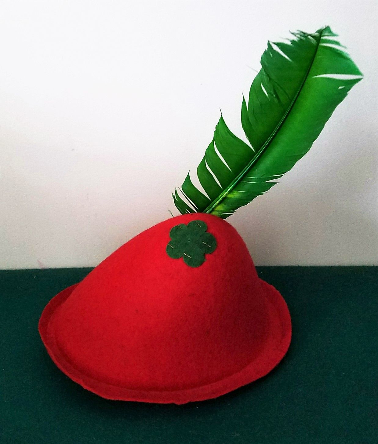 Felt hat with feather, child's size, 9" long X 5" tall, plus feather. Please use drop-down menu for any color preference.